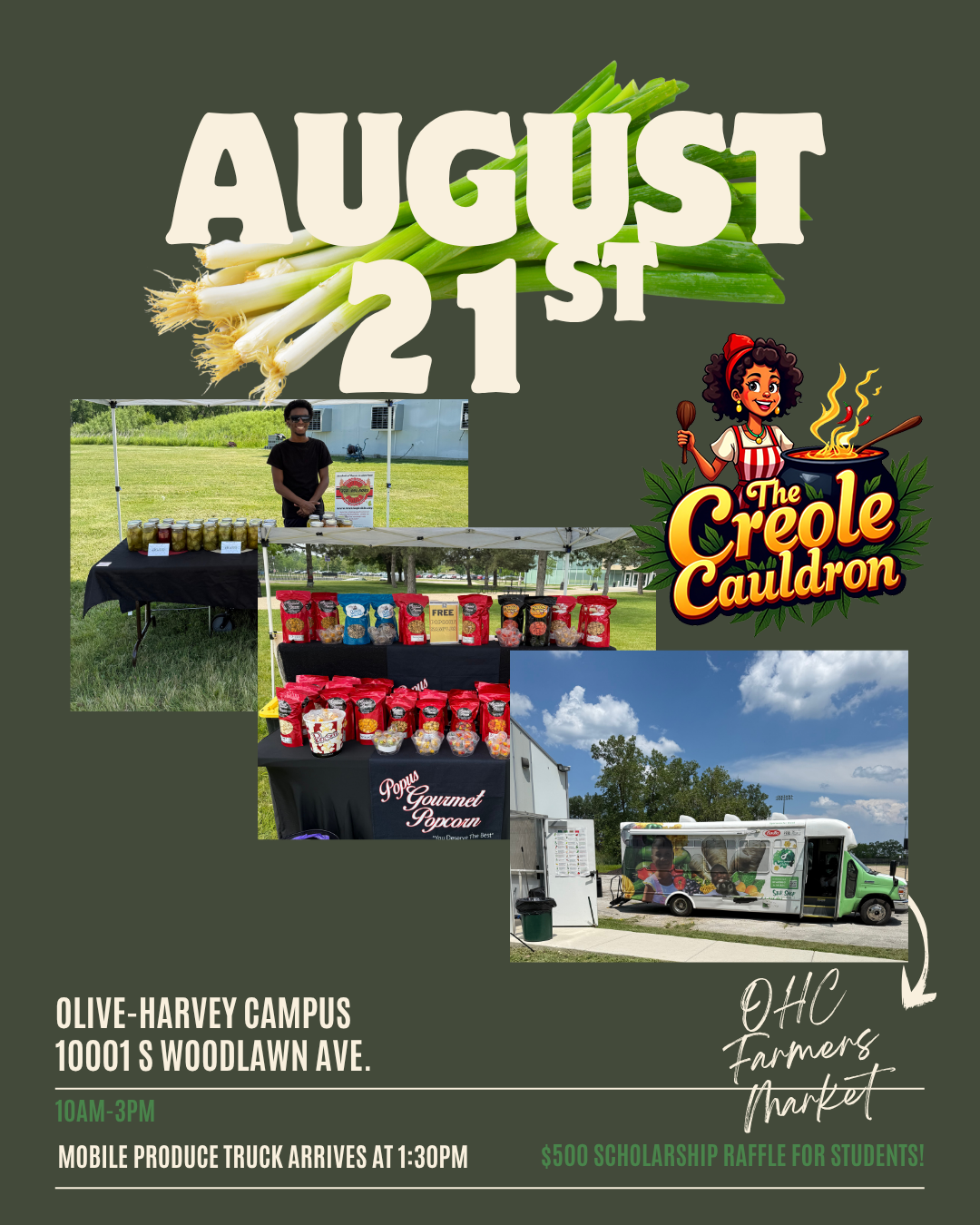 We’re excited to invite you to attend the 2025 Farmers Market Series at Olive-Harvey College, located in Chicago’s Pullman neighborhood — a vibrant community working to overcome the challenges of food access and economic disinvestment.